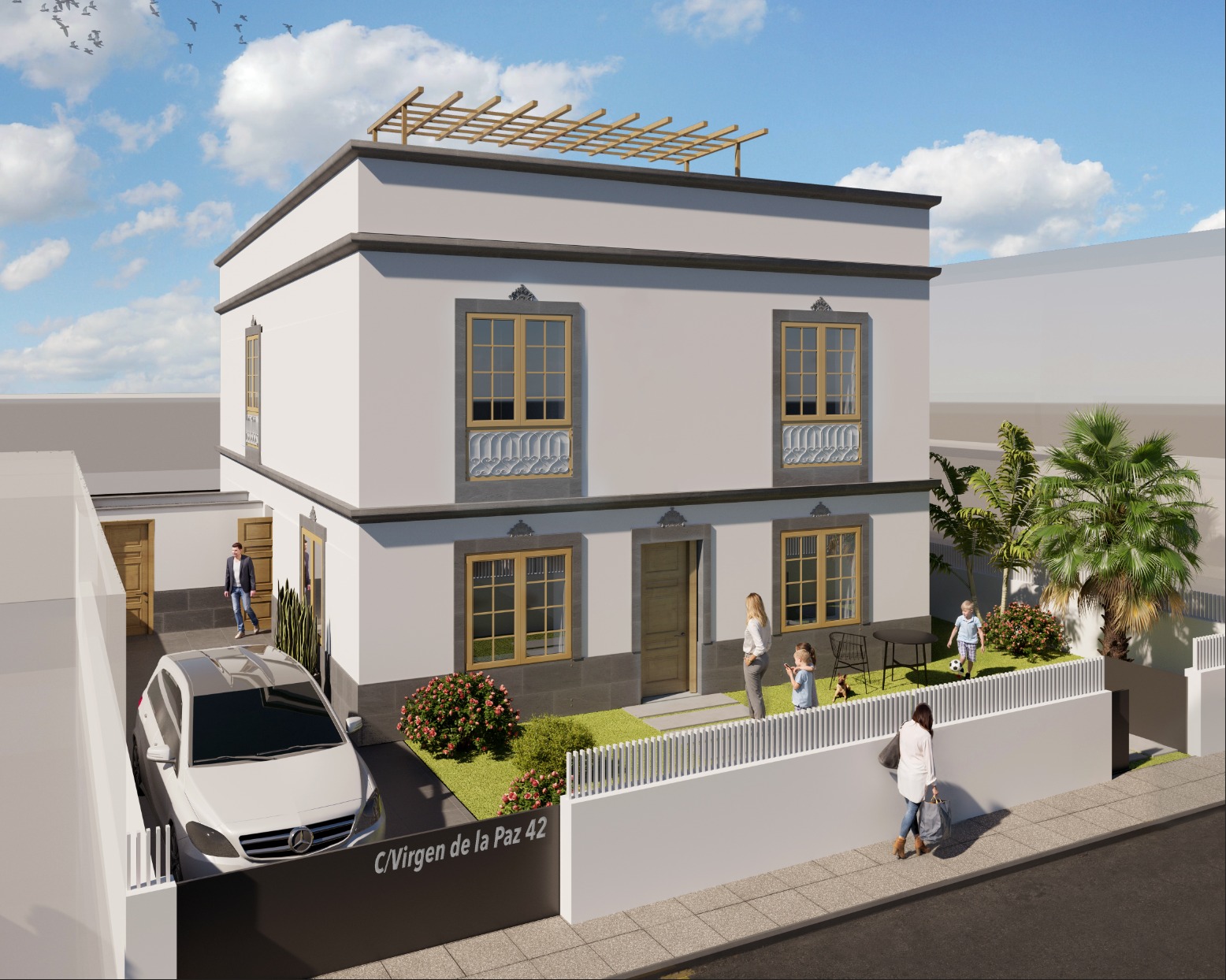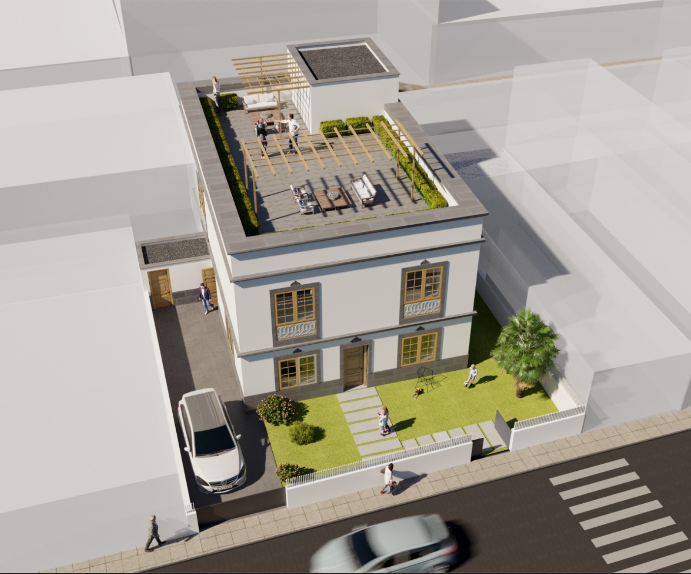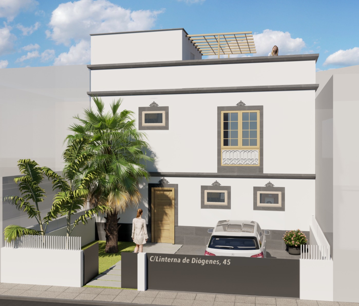 Uno de los puntos fuertes es la azotea totalmente diáfana para el disfrute en familia o con amigos, la cual corresponde a la vivienda en planta alta y el amplio jardín alrededor que correspondería a la vivienda en planta baja. Y por supuesto espacio para aparcar hasta dos vehículos en la propia parcela por cada vivienda.